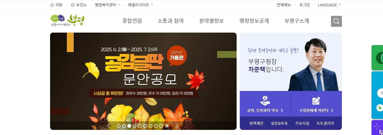 부평구청 홈페이지는 단순한 행정 정보 제공을 넘어 시민과의 소통과 참여를 강화하는 플랫폼으로 자리매김하고 있습니다. 특히 최근에는 지역 발전과 관련된 다양한 정보와 서비스를 제공하며 주목받고 있습니다. 이번 글에서는 부평구청 홈페이지의 주요 기능과 시민들이 관심을 가질 만한 내용을 중심으로 살펴보겠습니다.