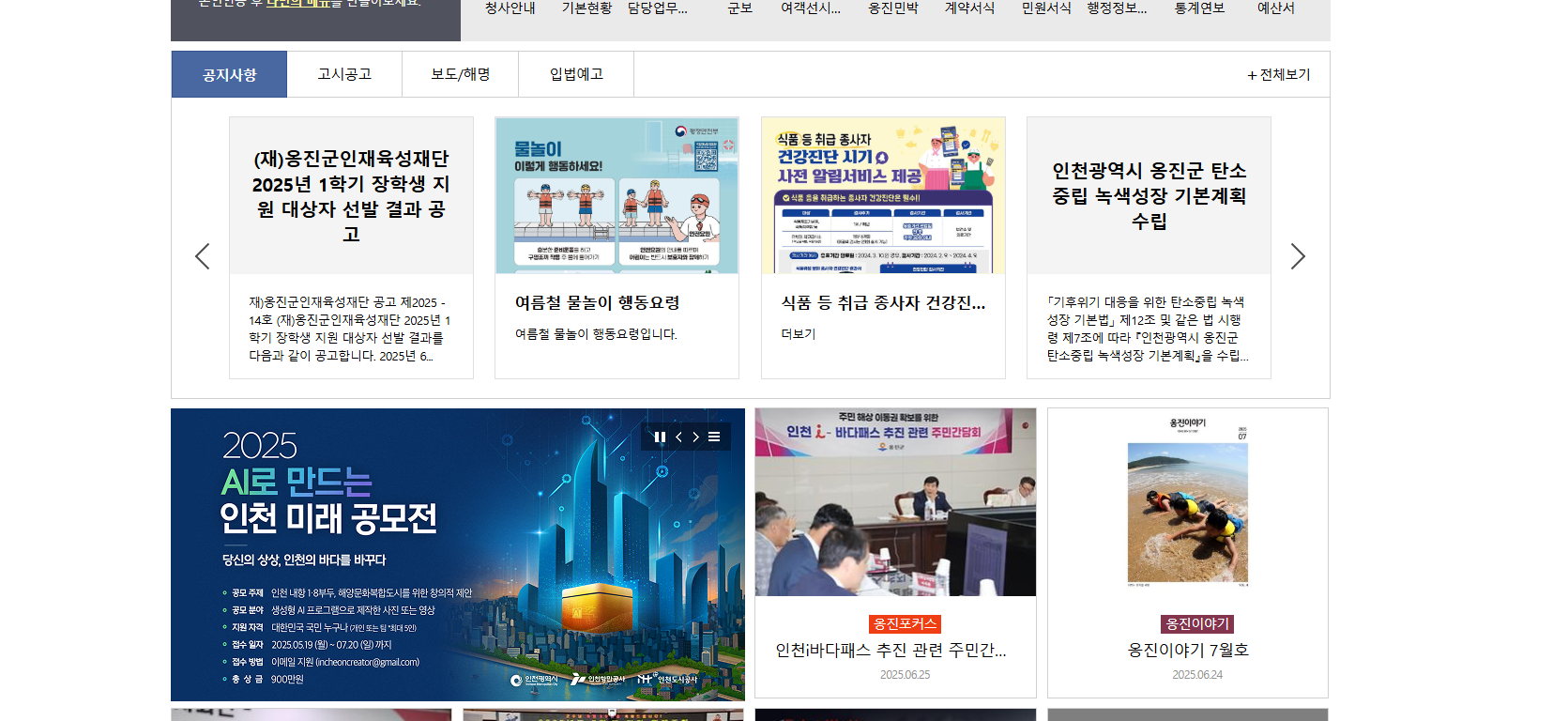 옹진군청 홈페이지 첫 화면 구성