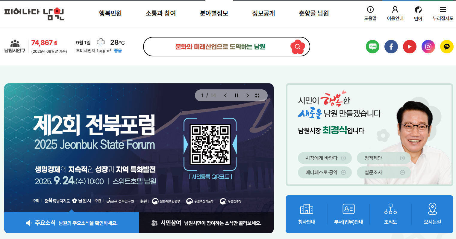 남원시는 **정부24(민원24)**와 연계하여 온라인 민원 서비스를 제공합니다. 집에서도 각종 증명서 발급 신청이 가능하며, 우편으로 수령하거나 무인발급기에서 출력할 수 있습니다.