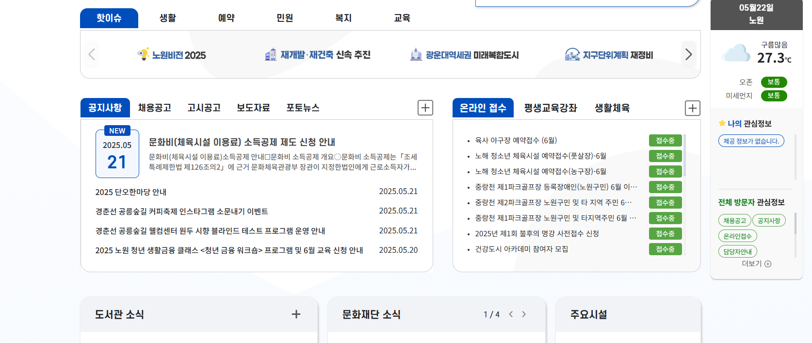 노원구청 홈페이지는 단순한 행정 정보 제공을 넘어 시민과의 소통과 참여를 강화하는 플랫폼으로 자리매김하고 있습니다. 특히 최근에는 지역 발전과 관련된 다양한 정보와 서비스를 제공하며 주목받고 있습니다. 이번 글에서는 노원구청 홈페이지의 주요 기능과 시민들이 관심을 가질 만한 내용을 중심으로 살펴보겠습니다.